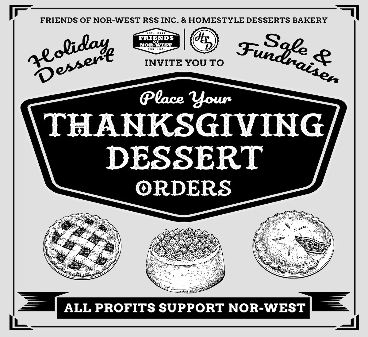 Order delicious pies, cheesecakes, and cookie trays for your Thanksgiving table — while supporting Nor-West’s recreation programs for individuals with developmental disabilities. A portion of every sale directly benefits Friends of Nor-West.